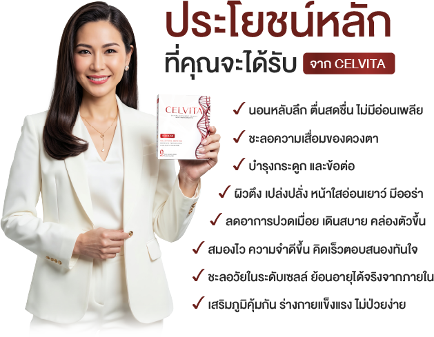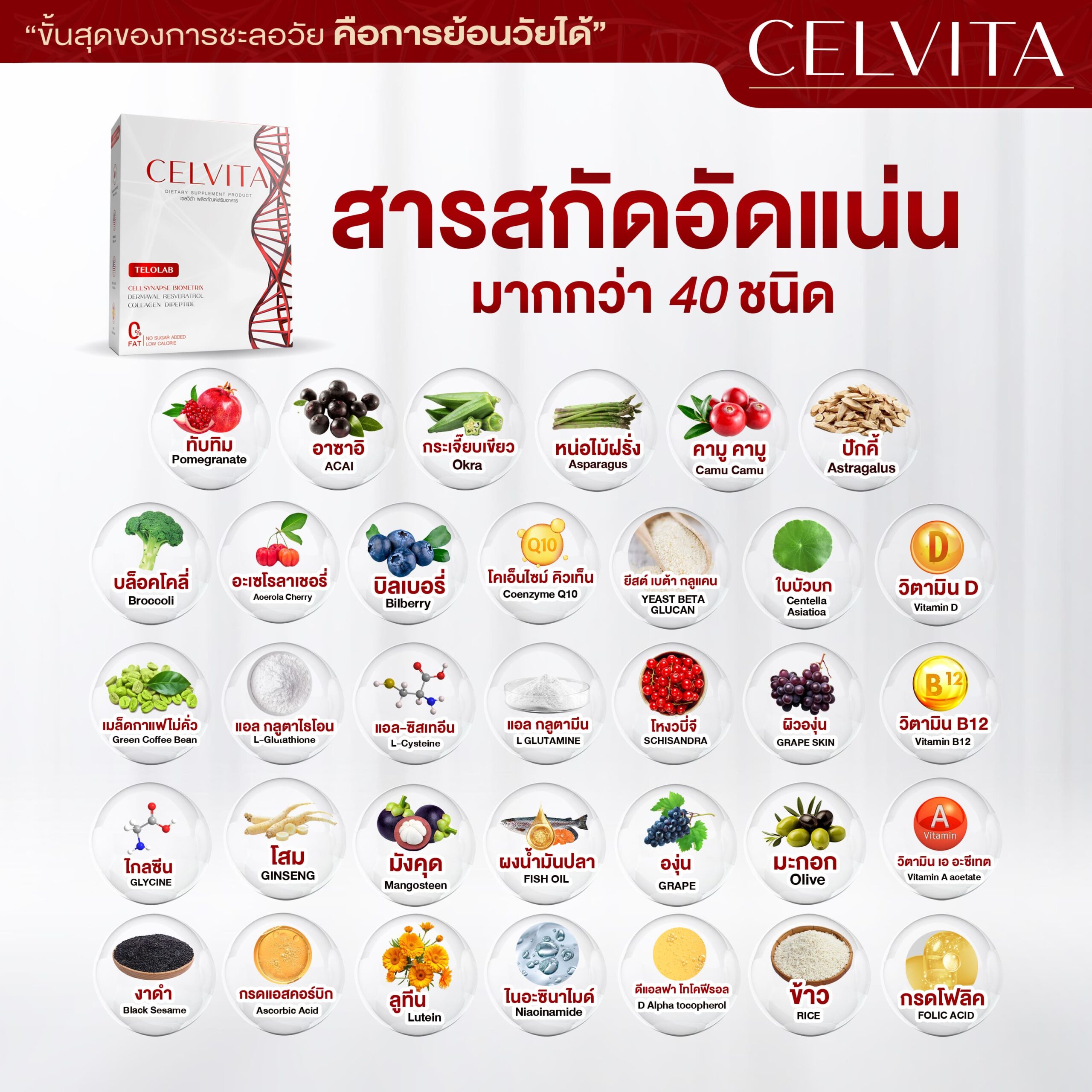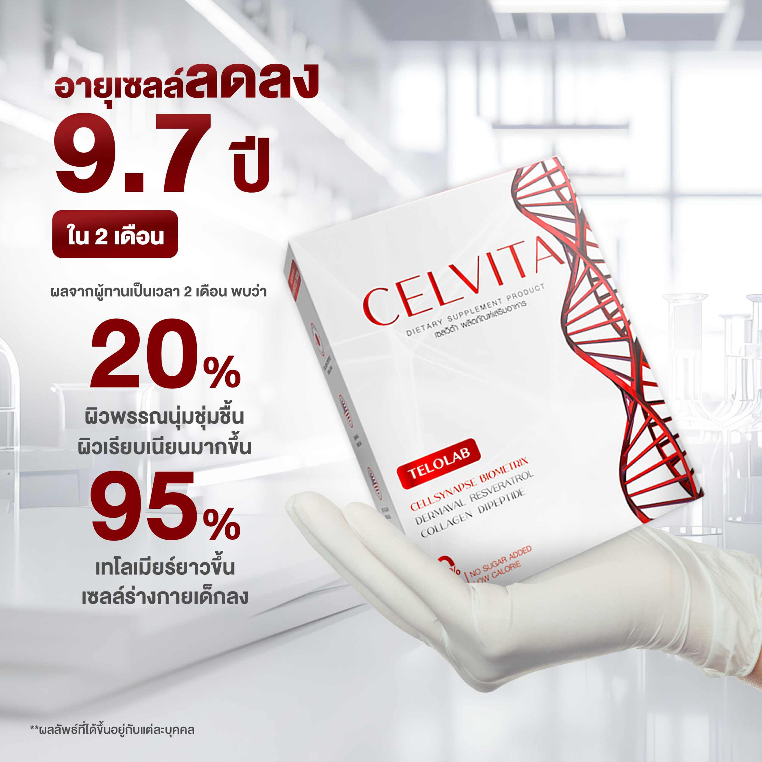 CELVITA ใช้สารสกัด Telomere™สารสกัดพิเศษที่พัฒนาโดยทีมนักวิทยาศาสตร์คนไทยช่วยกระตุ้นเอนไซม์เทโลเมอเรส ทำให้เทโลเมียร์ยาวขึ้นเซลล์แข็งแรง ชะลอความแก่ได้จริงในระดับ DNA